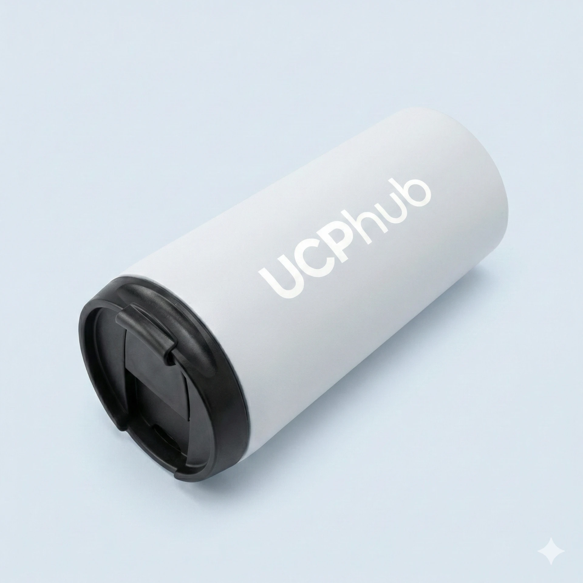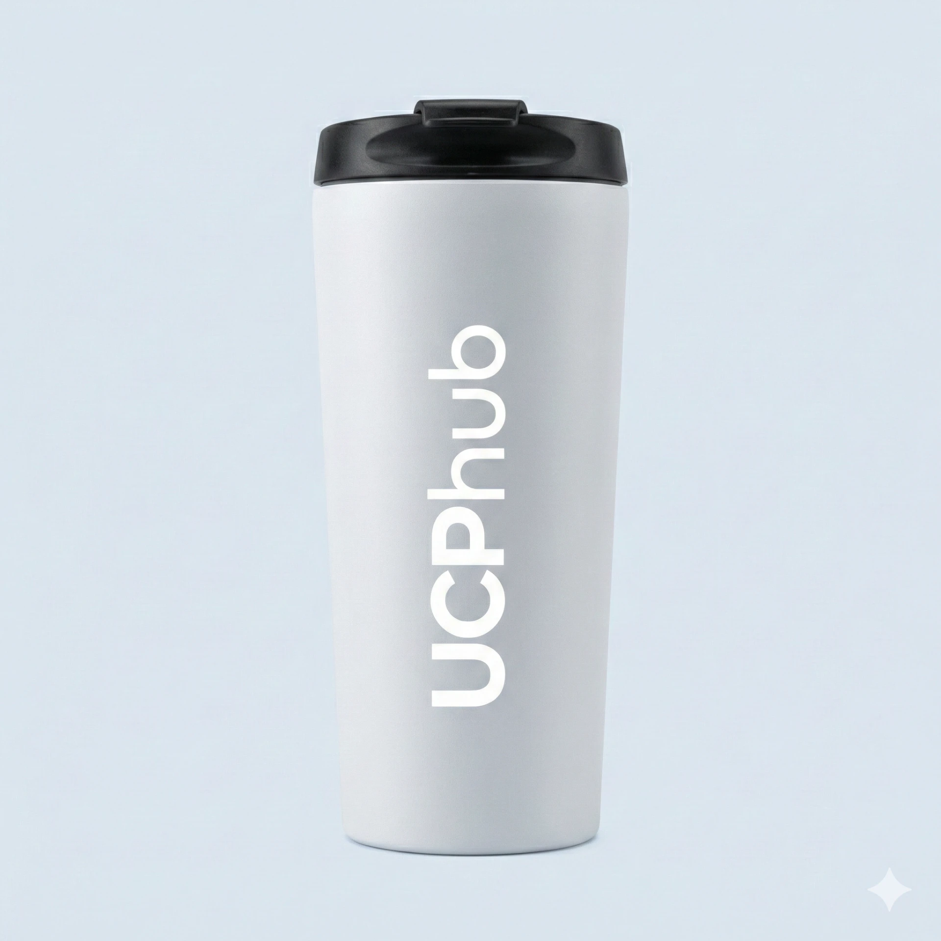 20oz double-wall stainless steel tumbler. Keeps drinks hot for 6 hours or cold for 12. Features a spill-resistant slide lid and a powder-coated white finish.