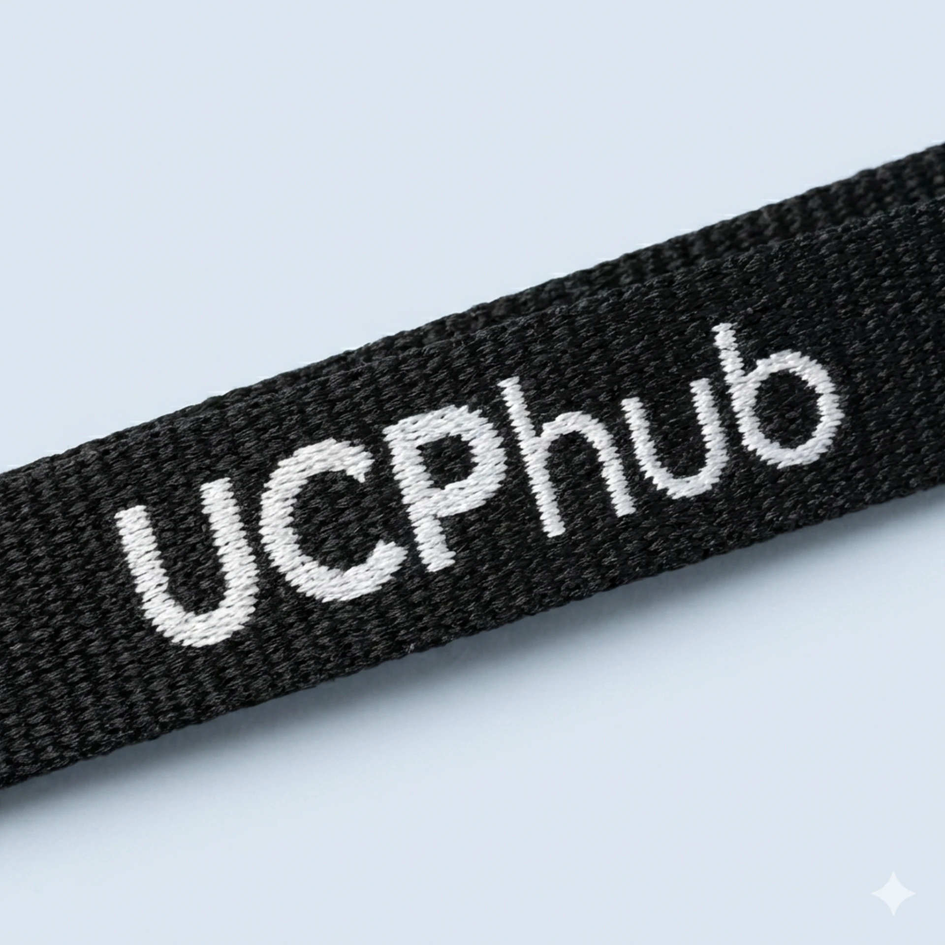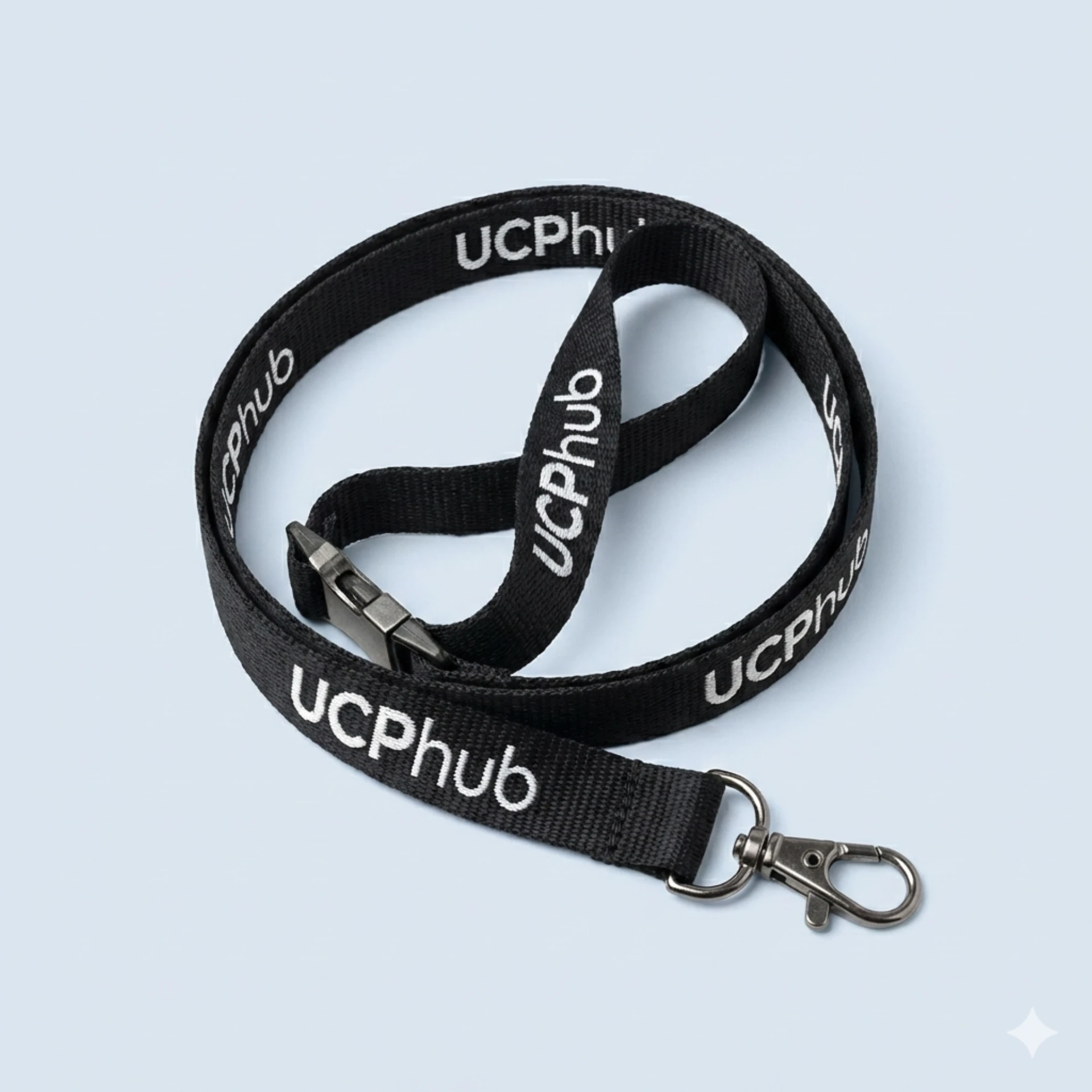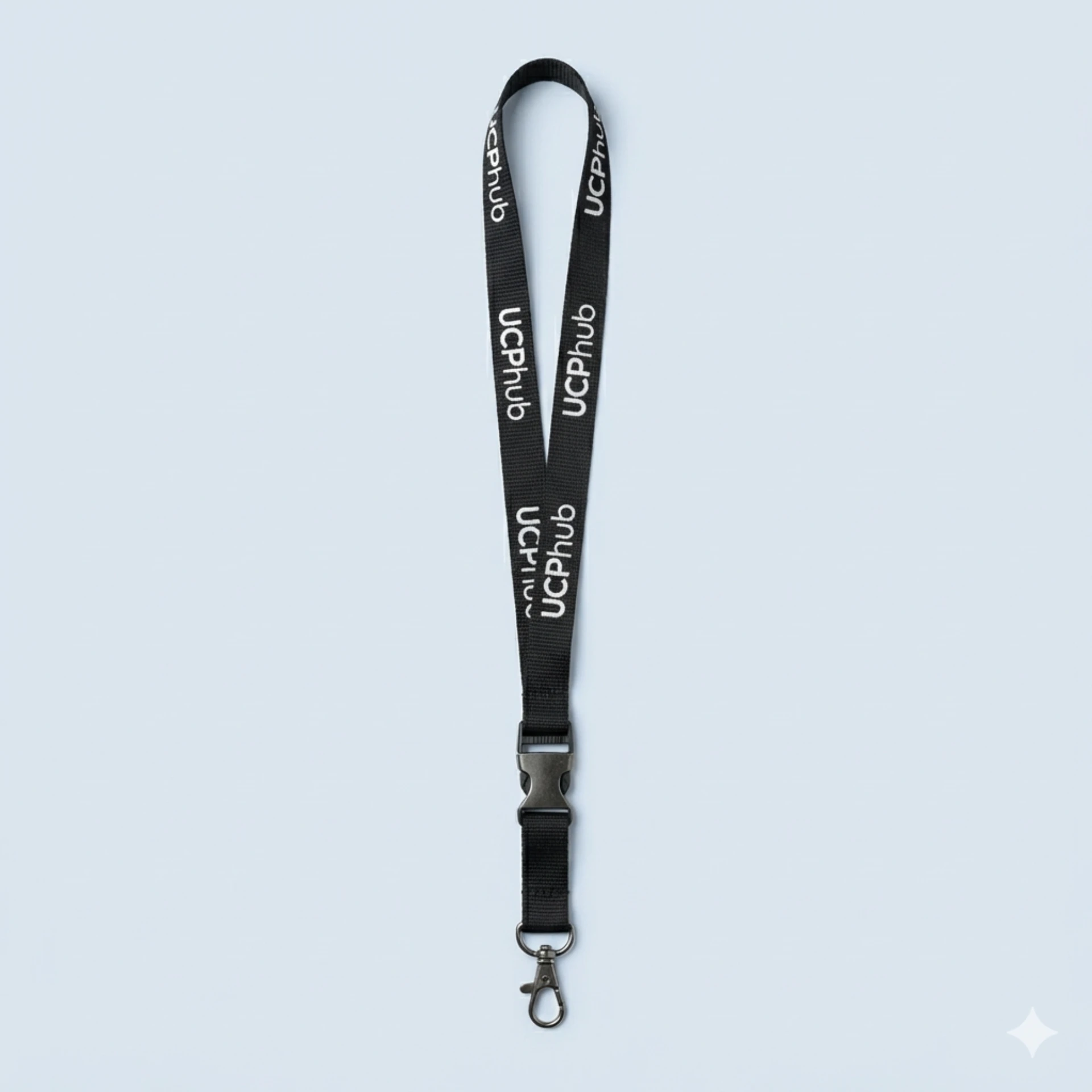 A durable polyester lanyard featuring a repeating logo pattern. Includes a detachable buckle and a metal lobster claw clasp for keys or ID badges.